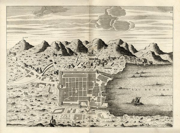 COMO - MORTIER, Pierre. 1724. "La ville de Como". Graziosa pianta della città , con il lago nel quale sono raffigurati velieri e paesaggio molto particolareggiato. Titolo in basso in un piccolo riquadro.
