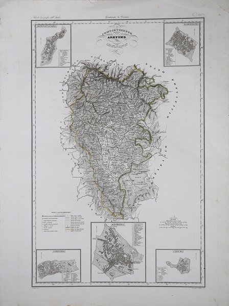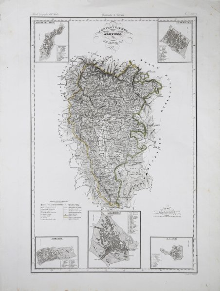 Carta geografica tratta dall’Atlante geografico degli Stati italiani delineato sopra le migliori e più moderne mappe per servire di corredo alla corografia fisica storica e statistica dell'Italia, di Attilio Zuccagni Orlandini stampato a Firenze, presso gli editori, 1844. In 2° massimo, 2 voll. Il primo volume contenente le carte dell’Italia Superiore in 52 fogli, il secondo volume quelle dell’Italia Inferiore in 77 fogli. Attilio Zuccagni Orlandini (1784-1872) nacque a Fiesole con il nome di Giuseppe Orlandini. In seguito all’adozione da parte del facoltoso zio materno Attilio Zuccagni (1754-1807), botanico e georgofilo, assunse il nome di Attilio Zuccagni Orlandini. La sua più importante opera è la relazione geografico-cartografica di tutti gli Stati preunitari italiani, la grandiosa Corografia fisica, storica e statistica dell’Italia e delle sue Isole (Firenze 1835-1845), in dodici volumi per diciannove tomi, con un volume introduttivo sull’intera penisola italiana. L’opera costituì la summa delle centinaia di opere geografiche generali, regionali e locali allora disponibili e presentava, per ogni Stato preunitario, la trattazione fisica, storica, topografica e un inquadramento statistico. Nel 1844-45, la Corografia fu arricchita con cinque volumi di cartografie, vedute e altre illustrazioni di luoghi e monumenti: Atlante geografico degli Stati italiani delineato sopra le migliori e più moderne mappe (due volumi con 144 tavole inclusa la grande carta della penisola in 15 fogli) e Atlante illustrativo ossia raccolta dei principali monumenti italiani antichi, del medio evo e moderni e di alcune vedute pittoriche (tre volumi con 413 illustrazioni, stampate su 269 fogli). Le tavole furono incise, sempre a Firenze, in due apposite officine, da quattro valenti artisti lombardi (Vittorio Angeli, Giacinto Maina, Pietro Manzoni e Giuseppe Pozzi). ' Soprattutto il primo dei due atlanti rappresenta, ancora oggi, una pietra miliare nella storia della cartografia e dell’iconografia geografica italiana. Fu veramente ‘un’ardua impresa’, dal momento che spesso mancavano ancora (come, ad esempio, per il Ducato di Lucca e lo Stato Pontificio) prodotti cartografici compiutamente geometrici. I due prodotti furono presentati ai Georgofili nel 1843 e nel 1844, insieme alla mappa della Repubblica di San Marino. L’opera si rivelò oltremodo costosa e non ottenne il successo commerciale sperato, ma servì da base per tante altre iniziative editoriali successive che vi attinsero, talora senza neppure rispettarne i diritti d’autore. Incisione in rame, ' finemente colorata a mano, ' in ottimo stato di conservazione. ' Bibliografia Cfr. Anna Guarducci - Dizionario Biografico degli Italiani - Volume 100 (2020). Map taken from the Atlante geografico degli Stati italiani delineato sopra le migliori e più moderne mappe per servire di corredo alla corografia fisica storica e statistica dell'Italia, di Attilio Zuccagni Orlandini printed in Florence, 1844. The first volume contains the maps of Northern Italy in 52 sheets, the second volume those of Southern Italy in 77 sheets. Attilio Zuccagni Orlandini (1784-1872) was born in Fiesole under the name of Giuseppe Orlandini. Following adoption by his wealthy maternal uncle Attilio Zuccagni (1754-1807), a botanist and georgofile, he took the name Attilio Zuccagni Orlandini. His most important work is the geographic-cartographic report of all the pre-unification Italian states, the great Corografia fisica, storica e statistica dell'Italia e delle sue Isole (Florence 1835-1845), in twelve volumes for nineteen tomes, with an introductory volume on the entire Italian peninsula. The work constituted the sum of hundreds of general, regional and local geographic works then available and presented, for each pre-unification state, the physical, historical, topographical and statistical framework. In 1844-45, the Corografia was enriched with five volumes of maps, views and other illustrations of places and monuments: Atlante geografico degli Stati italiani delineato sopra le migliori e più moderne mappe (two volumes with 144 plates including the large map of the peninsula in 15 sheets) and Atlante illustrativo ossia raccolta dei principali monumenti italiani antichi, del medio evo e moderni e di alcune vedute pittoriche (three volumes with 413 illustrations, printed on 269 sheets). The plates were engraved, again in Florence, in two special workshops, by four talented Lombard artists (Vittorio Angeli, Giacinto Maina, Pietro Manzoni and Giuseppe Pozzi). ' Especially the first of the two atlases represents, even today, a milestone in the history of cartography and Italian geographic iconography. It was truly 'an arduous undertaking', since cartographic products were often still lacking (as, for example, for the Duchy of Lucca and the Papal States) fully geometric. The two products were presented to the Georgofili in 1843 and 1844, along with the map of the Republic of San Marino. The work proved to be very expensive and did not achieve the commercial success hoped for, but served as a basis for many other subsequent publishing initiatives that drew on it, sometimes without even respecting the copyright. ' Copperplate with fine later hand colour, good condition. ' Literature Anna Guarducci - Dizionario Biografico degli Italiani - Volume 100 (2020). Cfr.