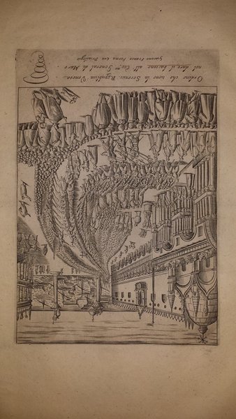Incisione su rame, 250 x 171 mm (alla battuta), foglio di 229 x 341 mm. Carta vergata forte e filigrana a due lune. "La veduta di una processione che esce dalla Chiesa di San Marco e va lungo la piazzetta avviandosi alle Colonne verso il mare, ove sono le galee." (Cicogna. Delle inscrizioni veneziane. Volume V, p. 439). All'interno della battuta la scritta: "Ordine che tiene la Sereniss. Repubblica Veneta nel dare il bastone all'Ecc.mo General di Mare. Franco forma con Privilegio". Bel foglio a pieni margini, inchiostratura stanca. Proveniente da "Habiti d'huomeni et donne venetiane con la processione della Ser.ma signoria et altri particolari cioè trionfi feste cerimonie publiche della nobilissima città di Venetia. ; La città di Venetia con l'origine e governo di quella. ; Habiti che gia' tempo usavano le donne vinetiane". Giacomo Franco (1550-1620). Figlio naturale del pittore e incisore Battista Franco e da tale Francesca da Urbino, nacque a Venezia, o più probabilmente a Urbino, nel 1550. Esercitò, operando sempre a Venezia, il mestiere di incisore, calcografo, editore benché nel suo testamento, rogato il 16 giugno 1620 dal notaio Fausto Doglioni, egli si definisca "desegnador". Il suo nome non ricorre mai negli atti dell'arte dei "libreri, stampatori e ligadori", mentre si trova negli elenchi della corporazione dei pittori, alle date 1606 e 1619, termini che indicano probabilmente l'anno di iscrizione all'arte, e quello di cessazione dell'attività.