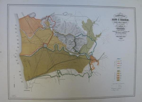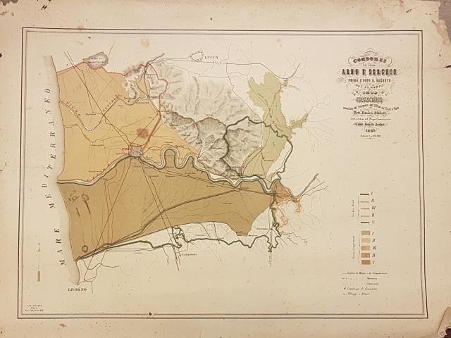 CONSORZI DEI FIUMI ARNO E SERCHIO PRIMA E DOPO IL DECRETO DEL 25 MARZO 1876. Pianta compilata dall'Ingegnere dell'Uffizio dei Fiumi e Fossi Dott. Ranieri Odifredi, dietro ordine del Regio Commissario Comm. Saverio Scolari, 1881.