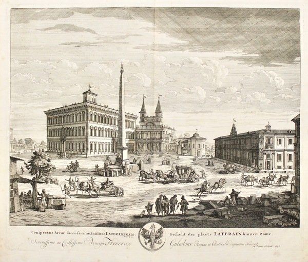Incisione in rame, mm 497x606 (lastra) e mm 541x630 (foglio). Rara e spettacolare veduta di San Giovanni in Laterano. Perfette condizioni. Copper engraving, mm 497x606 (platermark) and mm 541x630 (sheet). Signed "F.S. Petrus Schenk Amst." in the plate bottom right. Large view of the Basilica Laterano and his square. Perfect condition. <BR><BR>