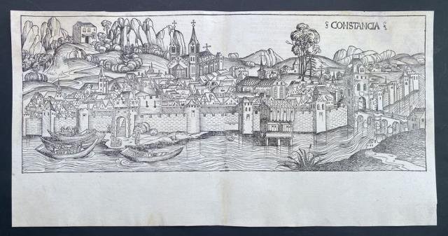 Dal “Liber Chronicarum Nurembergensi”, Anton Koberger, Norimberga, 1493. Xilografia stampata su doppia pagina, b/n, cm 28 x 54,5 circa (il foglio), al verso del foglio quattro figure, testo in latino. La monumentale opera dello Schedel, il "Liber Cronicarum", rappresenta uno “dei più straordinari lavori mai realizzati” dall’editoria del XV secolo. Restauro professionale, margini del foglio rifilati con mancanza della parte testuale ma presente la filettatura di inquadratura della veduta. Buono stato.