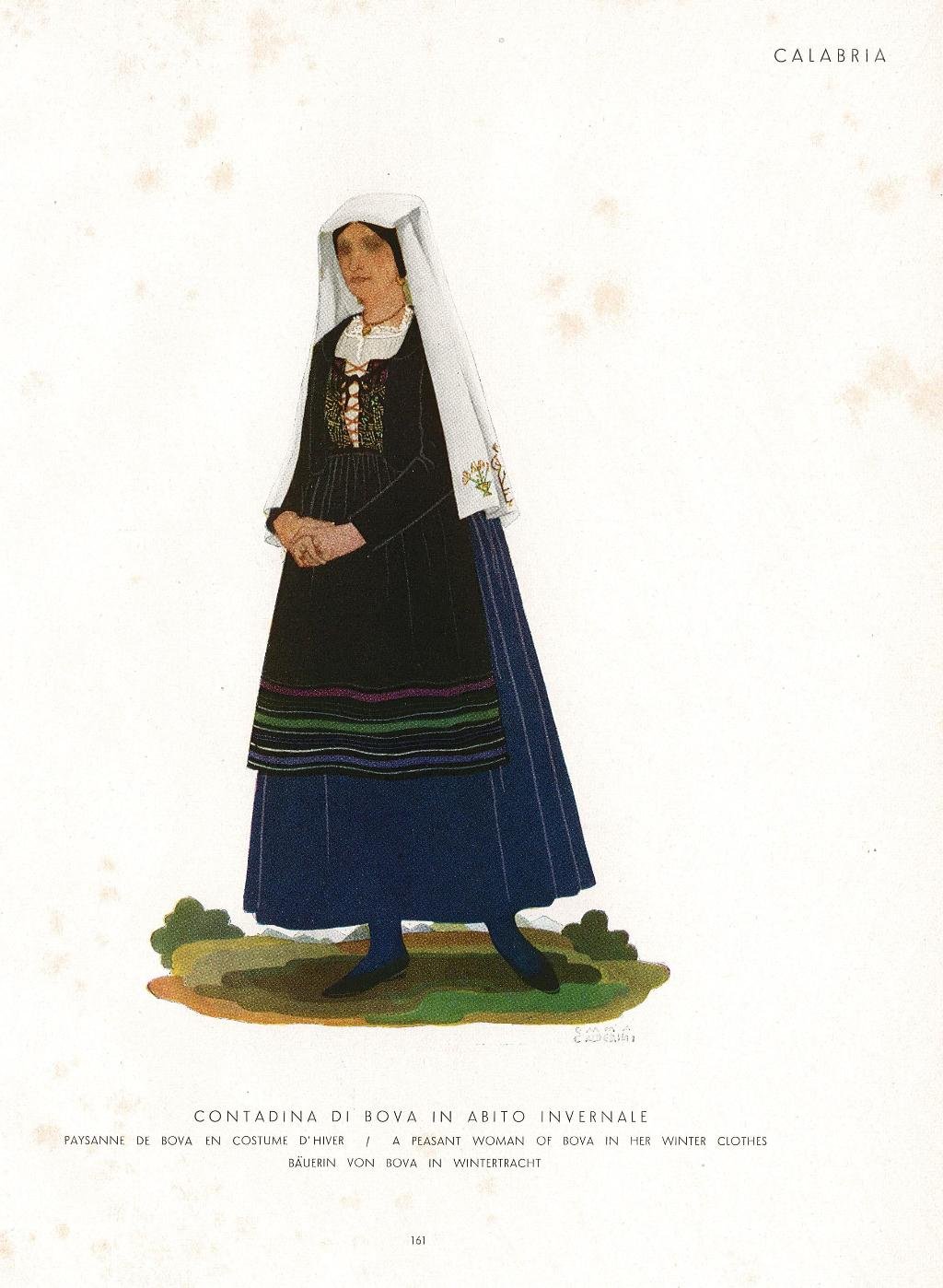 Stampa antica e originale raffigurante il costume caratteristico del luogo. Autore: Calderini Emma. Luogo: Bova - Reggio Calabria. Anno: 1920. Tecnica: tipolitografia. Dimensioni: 210x130. Tratta dall'opera "Il costume popolare in Italia" edita a Milano da Sperling & KupferPiccole macchie d'umidità. Piccole macchie d'umidità
