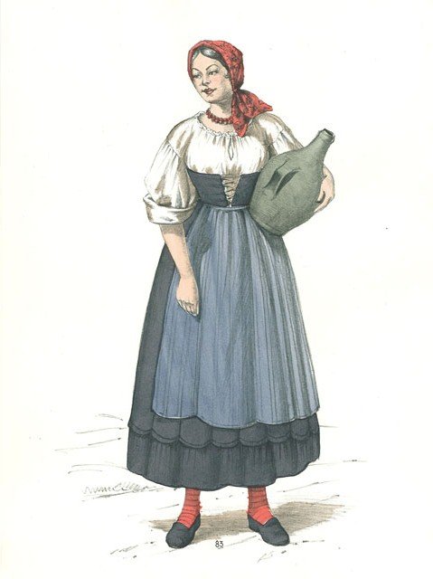 Costume caratteristico del luogo, disegnato, stampato e colorato a mano dal pittore Aldo Fornoni coadiuvato dalla pittrice Maria Angela Grassi