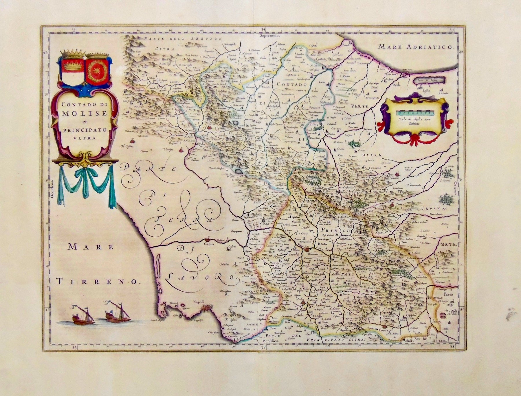 Incisione in rame, colorata d'epoca, 380x495. Elegante carta eseguita sull'originale di Magini. Ottimo esemplare. W. Blaeu, astronomo allievo di Tycho Brahe, fondò un'officina per la costruzione di globi nel 1599; quasi immediatamente iniziò a pubblicare anche carte geografiche, giungendo nel 1630 alla creazione del primo atlante "Atlantis Appendix" e cinque anni dopo, della prima edizione in due tomi del "Atlas Novus". Dopo la sua morte nel 1638, a cura del figlio Johan si giunse nel 1662 alla pubblicazione del celebre "Atlas Maior" in 11 volumi. Nel 1672 un incendio distrusse l'officina e segnò la fine dell'attività. Copper engraving, original colour, 380x495. Elegant map from the original by Bompard. A very good example. W. Blaeu, born in Alkmaar in 1571, studied astronomy by Tycho Brahe and founded a business in 1599 as a globe and instrument maker. He immediately expanded the business publishing maps and in 1630 the first atlas "Atlantis appendix" and five years later the "Atlas novus". After his death in 1638, his son Joan reached publication of the major work of the family, the "Atlas maior" in 11 volumes. in 1672 a great fire destroyed the Blaeu's printing house.