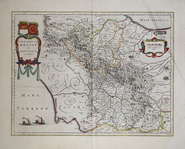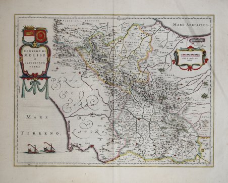 Carta geografica del territorio del Molise. Incisione in rame, coloritura coeva, in ottimo stato di conservazione. Testo francese al verso.In alto, cartiglio con stemmi ed altra vignetta con scala delle miglia. Due galere al largo di Capo Miseno. Willem Janszoon Blaeu, avviò nel 1599 la sua attività di costruttore di globi e strumenti astronomici ad Amsterdam. Nel 1630, dopo aver comprato alcune lastre dell’atlante del Mercator da Jodocus Hondius II, fu in grado di pubblicare un volume di 60 mappe con il titolo di ' Atlantis Appendix. Cinque anni dopo, pubblicò i primi due volumi del suo atlante ' Atlas Novus ' o ' Theatrum Orbis Terrarum, ' in sei libri. Dopo la sua morte, Joan (Johannes) continuò l’opera paterna, completando l’intera serie di sei volume dell’Atlas Novus ' intorno al 1655. Fu inoltre autore di un ' Atlas Maior sive Cosmographia Blaviana, in 12 volumi pubblicati nel 1662 -72. Meraviglioso esemplare. Carta geografica del territorio del Molise. Incisione in rame, coloritura coeva, in ottimo stato di conservazione. Testo francese al verso.In alto, cartiglio con stemmi ed altra vignetta con scala delle miglia. Due galere al largo di Capo Miseno. Willem Janszoon Blaeu, started in 1599 his business as a builder of globes and astronomical instruments in Amsterdam. In 1630, after buying some plates of the Mercator atlas from Jodocus Hondius II, he was able to publish a volume of 60 maps under the title ' Atlantis Appendix. Five years later, he published the first two volumes of his atlas ' Atlas Novus ' or ' Theatrum Orbis Terrarum, in six books. After his death, Joan (Johannes) continued his father's work, completing the entire six-volume ' Atlas Novus ' series around 1655. He was also the author of an ' Atlas Maior sive Cosmographia Blaviana, in 12 volumes published in 1662 -72. Meraviglioso esemplare. Cfr.