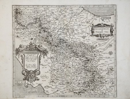 Carta geografica tratta dal ' L’Italia ' a cura di Fabio Magini, edito a Bologna nel 1620, tre anni dopo la prematura morte del padre. Composto da un breve testo descrittivo di sole 24 carte, l’opera è corredata di 61 carte geografiche della penisola, e costituisce il primo esempio di atlante italiano. L’opera è per intero di mano del Magini, che iniziò la realizzazione delle carte nel 1594 circa, dando alla luce per prima nel 1595 la carta del territorio di Bologna. Tutte le carte vennero alle stampe quindi prima del 1620, nelle loro stesure provvisorie, successivamente corrette ed aggiornate per l’edizione definitiva. Per la realizzazione delle lastre il Magini si servì di due dei più famosi intagliatori dell’epoca: il belga Arnoldo Arnoldi e l’inglese Benjamin Wright. Il Magini, per le nove carte del Regno di Napoli, si ispirò al rilievo ufficiale eseguito dallo studioso nolano Niccolò Antonio Stigliola il collaborazione con il cartografo viterbese Mario Cartaro, che tra il 1583 ed il 1594 ebbero l’incarico di realizzare una grande carta del reame. Incise da Benjamin Wright. Nel lato destro della carta, un cartiglio con il titolo ' CONTADO DI MOLISE & Principato Ultra. Sotto il cartiglio la scala grafica ' Scala di Miglia dieci ' (10 miglia pari a mm 45). Nella lapide a destra ornata con mascheroni e cornucopie la dedica Al Molto Ill:re Signor mio osser.mo il Sig.r Giovanni Ansalone de i Signori Giurati della nobiliss.a città di Messina. Gio: Antonio Magini Padovano Mathematico dello studio di Bologna. ' Orientazione nei quattro lati al centro con il nome dei punti cardinali Septentrio, Meridies, Oriens, Occidens, il nord in alto. Graduazione ai margini di 1’ in 1’ da 40° 51’ 20’’ a 42° 1’ 45’’ di latitudine, e da 37° 10’ a 38° 56’ di longitudine. Esemplare dell'unico stato conosciuto, con la firma di Giovanni Antonio Magini. In buono stato di conservazione. Bibliografia Almagià (1922): pp. 73-78, n. 20. Map taken from ' L'Italia ' edited by Fabio Magini, published in Bologna in 1620, three years after the untimely death of his father. Composed of a short descriptive text of only 24 pages, the work is accompanied by 61 maps of the peninsula, and is the first example of an Italian atlas. The work is entirely by the hand of Giovanni Antonio Magini, who began the realization of the maps in 1594 or so; the first dated map (1595) the map of the territory of Bologna. All the maps were printed before 1620, in their provisional drafts, later corrected and updated for the final edition. For the realization of the plates Magini used two of the most famous engravers of the time: the Belgian Arnoldo Arnoldi and the English Benjamin Wright. Copperplate, in good condition. Nel lato destro della carta, un cartiglio con il titolo ' CONTADO DI MOLISE & Principato Ultra. Sotto il cartiglio la scala grafica ' Scala di Miglia dieci ' (10 miglia pari a mm 45). Nella lapide a destra ornata con mascheroni e cornucopie la dedica Al Molto Ill:re Signor mio osser.mo il Sig.r Giovanni Ansalone de i Signori Giurati della nobiliss.a città di Messina. Gio: Antonio Magini Padovano Mathematico dello studio di Bologna. ' Orientazione nei quattro lati al centro con il nome dei punti cardinali Septentrio, Meridies, Oriens, Occidens, il nord in alto. Graduazione ai margini di 1’ in 1’ da 40° 51’ 20’’ a 42° 1’ 45’’ di latitudine, e da 37° 10’ a 38° 56’ di longitudine. Esemplare dell'unico stato conosciuto, con la firma di Giovanni Antonio Magini. In buono stato di conservazione. Bibliografia Almagià (1922): pp. 73-78, n. 20. Cfr.