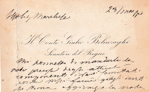 *Conte GIULIO BELINZAGHI Senatore del Regno. Biglietto da visita manoscritto e firmato.