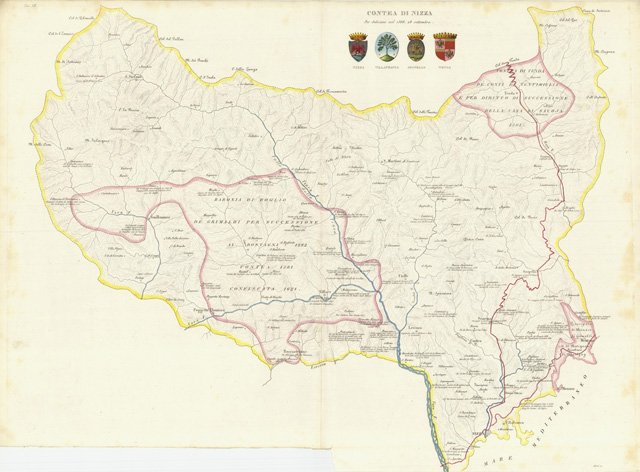 Carta geografica delle Valli di Reja e Tinea con evidenziate le cittadine di: S. Stefano, Guillaumes, Poggetto Theniers, Villars, Roccasterone, S. Martino, Utelle, Levenzo, Tenda, Saorgio, Broglio, Sospello, Scarena, Contes, Nizza, Villafranca, Monaco e Mentone. Straodinaria è la coloritura coeva con stemmi, di Nizza, Villafranca, Sospello e Tenda, miniati e rialzati in oro e argento. Ottimo lo stato di conservazione. Piega centrale editoriale cd2606