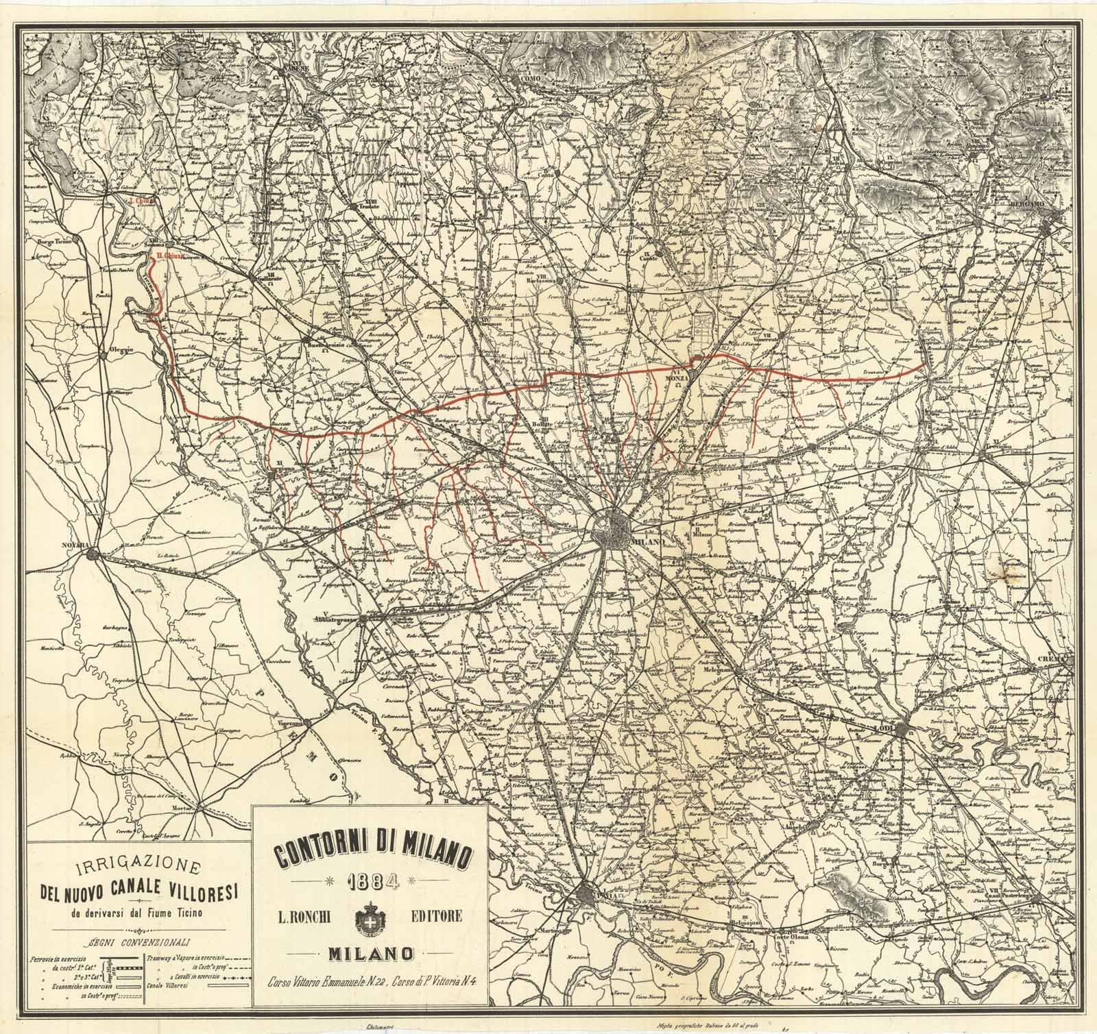 Carta dei contorni di Milano edita da Luigi Ronchi a Milano nel 1884. In rosso è indicazto l'andamento del nuovo canalle Villoresi da derivarso dal fiume Ticino con relativa irrigazione. Nell'angolo in basso a sinistra sono riportati i "Segni Convenzionali" con indciazione delle Ferrovie in esercizio, da costruirsi di 1a cat, da costruirsi di 2a e 3a cat e quelle in costruzione o solo progettate. Sono altrsì indicati i Tramway a vapore in esercio, quelli in costruzione o progettati ed i Tramway a cavalli in esercizio. Il territorio rappresentato è compreso tra Novara, Pavia, Lodi, Crema, Bergamo, Como e Varese. Restauro professionale ad una delle pieghe editoriali che interessa una piccola porzione di parte incisa, ma senza fastidio. In calce la sola indicazione delle scale, senza scala metrica.
