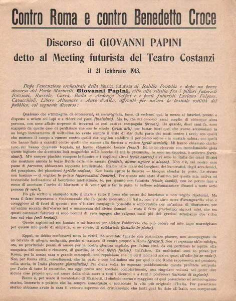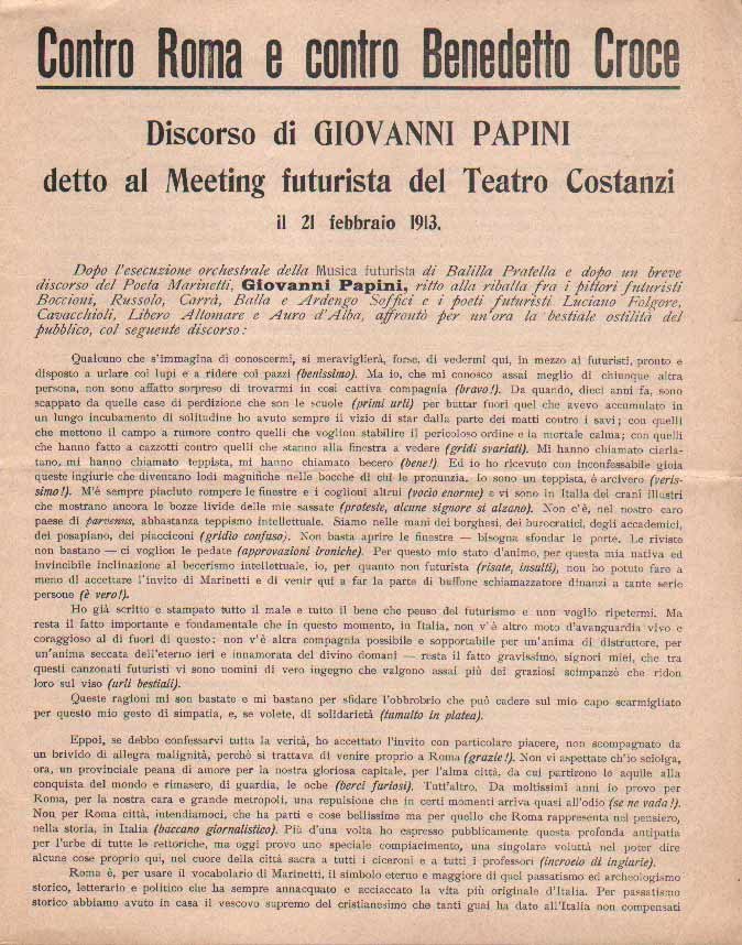 CONTRO ROMA E CONTRO BENEDETTO CROCE. - Discorso di Giovanni Papini detto al Meeting futurista del Teatro Costanzi il 21 febbraio 1913.