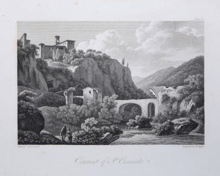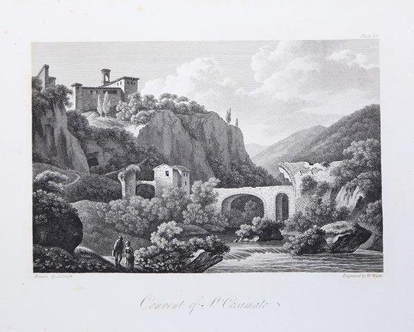 Veduta tratta da ' Select views in Italy, with topographical and historical descriptions in English and French. Vol. I. (II.) London (Place), printed by T. Chapman, for John Smith, William Byrne, and John Emes, 1792. (1796) di Smith, John Warwick (1749-1831). Tutte le lastre sono firmate come disegnate da J. Smith - in tre casi come disegni di Wm. ' Cowper, Sir Rd. C. Hoare o T. Jones. Sono incise da T. Medland, Willm. Byrne, J. Schuman, B.T. Pouncy, J. Emes, J. Landseer, J. Roffe, Jas. ' Sparrow, W. Watts, J. Shirt o W. Lowry. Secondo un prospetto datato 1° dicembre 1791, l'opera venne pubblicata a dispense, in 10 numeri, ed è dedicata da John Smith alla Regina [Charlotte]. John "Warwick" Smith (26 luglio 1749 - 22 marzo 1831) è stato un pittore e illustratore britannico di paesaggi ad acquerello. Smith nacque a Irthington, vicino a Carlisle, nel Cumberland, figlio di un giardiniere della famiglia Gilpin, e fu educato a St. Bees. Il fortunato legame sociale gli permise di studiare arte sotto la guida del pittore di animali Sawrey Gilpin. Diventato noto come abile disegnatore topografico, fu impiegato per le ' Select Views in ' Great Britain di Samuel Middiman e ottenne il patrocinio di George Greville, secondo conte di Warwick, che gli permise di viaggiare in Italia tra il 1776 e il 1781. Acquaforte, alcune ossidazioni, per il resto in ottimo stato di conservazione. View taken from the ' Select views in Italy, with topographical and historical descriptions in English and French. Vol. I. (II.) London (Place), printed by T. Chapman, for John Smith, William Byrne, and John Emes, 1792. (1796) by Smith, John Warwick (1749--1831). All plates are signed as drawn by J. Smith - in three cases as after sketches by Wm. Cowper, Sir Rd. C. Hoare or T. Jones. They are signed as engraved by T. Medland, Willm. Byrne, J. Schuman, B.T. Pouncy, J. Emes, J. Landseer, J. Roffe, Jas. Sparrow, W. Watts, J. Shirt or W. Lowry. According to a prospectus dated 1 December 1791 the work was to be issued in 10 numbers. The work is dedicated by John Smith to the Queen [Charlotte]. John "Warwick" Smith (26 July 1749 – 22 March 1831) was a British watercolour landscape painter and illustrator. Smith was born at Irthington, near Carlisle, Cumberland, the son of a gardener to the Gilpin family, and educated at St. Bees. The fortunate social connection allowed him to study art under the animal painter Sawrey Gilpin. Copperplate, some foxing, otherwise good condition. Cfr.