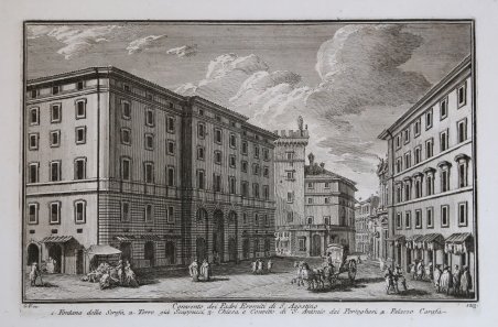 Veduta tratta dalla monumentale opera ' Delle magnificenze di Roma antica e moderna.Pubblicata in 10 volumi dal 1747 al 1761, l’opera presenta 238 incisioni in rame, ciascuna incisione con testo narrativo che fornisce informazioni storiche e documentarie. ' Conosciuto dai più semplicemente come il "maestro" di Giovanni Battista Piranesi, Giuseppe Vasi rivela in quest'opera monumentale la pienezza della sua creatività grafica. I 10 libri che la compongono hanno ognuno un frontespizio con titolo e data diversi: ' Libro primo che contiene le porte e mura; Libro secondo, che contiene le piazze principali di Roma con obelischi, colonne, ed altri ornamenti; Libro terzo, che contiene le basiliche e chiese antiche di Roma; Libro quarto che contiene i palazzi e le vie più celebri; Libro quinto che contiene i ponti e gli edifizj sul Libro sesto che contiene la chiese parrocchiali; Libro settimo che contiene i conventi e case dei chierici regolari; Libro ottavo che contiene i monasteri e conservatorj di donne; Libro nono che contiene i collegj, spedali, e luoghi pii; decimo che contiene le ville e giardini più rimarchevoli. Le ' Magnificenze ' forniscono un panorama completo e al tempo stesso anticonvenzionale dell'Urbe: così, insieme alle consuete, celeberrime inquadrature desunte dalla migliore tradizione vedutistica, si trova anche una Roma insolita, quella che, talvolta, non esiste più. A quest'opera, di centrale importanza nell'editoria romana di metà Settecento, l'Autore aveva lavorato per quasi un ventennio realizzando una monumentale guida dell'Urbe dove accanto alle consuete e celeberrime inquadrature tratte dalla migliore tradizione vedutistica, immortala anche scorci insoliti che sono poi scomparsi con il cambiare della città. Il testo che accompagna le vedute nel primo volume è opera di Giuseppe Bianchini, nel secondo di Orazio Orlandi e nei restanti del Vasi stesso. A partire dall'edizione del 1786, l'opera del Vasi, fu aggiornata dal figlio Mariano, che la pubblicò col titolo ' Raccolta delle più belle vedute antiche, e moderne di Roma, mostrando solo il nome del padre come autore. Questa nuova edizione presentava molte tavole della prima edizione, ed alcune nuove. Anche la pubblicazione di Mariano Vasi fu stampata più volte, sempre con l’aggiunta di nuove tavole. Esemplare tratto dall'edizione del 1786. Acquaforte, stampata su carta vergata coeva, completa dei margini, in ottimo stato di conservazione. ' View taken from the monumental work ' Delle magnificenze di Roma antica e moderna. Published in 10 volumes from 1747 to 1761, the work features 238 copper engravings, each engraving with a narrative text that provides historical and documentary information. Known by most simply as the "master" of Giovanni Battista Piranesi, Giuseppe Vasi reveals in this monumental work the fullness of his graphic creativity. The 10 books that compose it each have a title page with a different title and date: ' Libro primo che contiene le porte e mura; Libro secondo, che contiene le piazze principali di Roma con obelischi, colonne, ed altri ornamenti; Libro terzo, che contiene le basiliche e chiese antiche di Roma; Libro quarto che contiene i palazzi e le vie più celebri; Libro quinto che contiene i ponti e gli edifizj sul Libro sesto che contiene la chiese parrocchiali; Libro settimo che contiene i conventi e case dei chierici regolari; Libro ottavo che contiene i monasteri e conservatorj di donne; Libro nono che contiene i collegj, spedali, e luoghi pii; decimo che contiene le ville e giardini più rimarchevoli. The ' Magnificences ' provide a complete and at the same time unconventional panorama of the City: thus, together with the usual, celebrated shots taken from the best tradition of ' vedutistica, one also finds an unusual Rome, one that, at times, no longer exists. The author had worked on this work, of central importance in Roman publishing in the middle of the eighteenth century, for almost twenty years, producing a monumental guide to the “Urbe” where, alongside the usual and famous shots taken from the best tradition of ' vedutistica, he also immortalized unusual views that have since disappeared with the change of the city. The text that accompanies the views in the first volume is by Giuseppe Bianchini, in the second by Orazio Orlandi and in the remaining ones by Vasi himself. Starting from the edition of 1786, the work of Vasi, was updated by his son Mariano, who published it under the title ' Raccolta delle più belle vedute antiche, e moderne di Roma, showing only the name of his father as author. This new edition presented many plates of the first edition, and some new ones. The publication of Mariano Vasi was also printed several times, always with the addition of new plates. ' View taken from 1786 edition of the Vasi’s ' Delle Magnificenze di Roma Antica e Moderna. Etching, printed on contemporary laid paper, in very good condition. Cfr. Scalabroni, 212