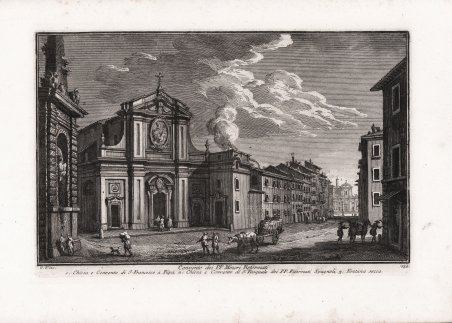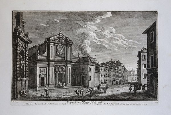 Veduta tratta dalla monumentale opera ' Delle magnificenze di Roma antica e moderna.Pubblicata in 10 volumi dal 1747 al 1761, l’opera presenta 238 incisioni in rame, ciascuna incisione con testo narrativo che fornisce informazioni storiche e documentarie. ' Conosciuto dai più semplicemente come il "maestro" di Giovanni Battista Piranesi, Giuseppe Vasi rivela in quest'opera monumentale la pienezza della sua creatività grafica. I 10 libri che la compongono hanno ognuno un frontespizio con titolo e data diversi: ' Libro primo che contiene le porte e mura; Libro secondo, che contiene le piazze principali di Roma con obelischi, colonne, ed altri ornamenti; Libro terzo, che contiene le basiliche e chiese antiche di Roma; Libro quarto che contiene i palazzi e le vie più celebri; Libro quinto che contiene i ponti e gli edifizj sul Libro sesto che contiene la chiese parrocchiali; Libro settimo che contiene i conventi e case dei chierici regolari; Libro ottavo che contiene i monasteri e conservatorj di donne; Libro nono che contiene i collegj, spedali, e luoghi pii; decimo che contiene le ville e giardini più rimarchevoli. Le ' Magnificenze ' forniscono un panorama completo e al tempo stesso anticonvenzionale dell'Urbe: così, insieme alle consuete, celeberrime inquadrature desunte dalla migliore tradizione vedutistica, si trova anche una Roma insolita, quella che, talvolta, non esiste più. A quest'opera, di centrale importanza nell'editoria romana di metà Settecento, l'Autore aveva lavorato per quasi un ventennio realizzando una monumentale guida dell'Urbe dove accanto alle consuete e celeberrime inquadrature tratte dalla migliore tradizione vedutistica, immortala anche scorci insoliti che sono poi scomparsi con il cambiare della città. Il testo che accompagna le vedute nel primo volume è opera di Giuseppe Bianchini, nel secondo di Orazio Orlandi e nei restanti del Vasi stesso. A partire dall'edizione del 1786, l'opera del Vasi, fu aggiornata dal figlio Mariano, che la pubblicò col titolo ' Raccolta delle più belle vedute antiche, e moderne di Roma, mostrando solo il nome del padre come autore. Questa nuova edizione presentava molte tavole della prima edizione, ed alcune nuove. Anche la pubblicazione di Mariano Vasi fu stampata più volte, sempre con l’aggiunta di nuove tavole. Esemplare tratto dalla seconda edizione del 1772. Acquaforte, stampata su carta vergata coeva, completa dei margini, in ottimo stato di conservazione. ' View taken from the monumental work ' Delle magnificenze di Roma antica e moderna. Published in 10 volumes from 1747 to 1761, the work features 238 copper engravings, each engraving with a narrative text that provides historical and documentary information. Known by most simply as the "master" of Giovanni Battista Piranesi, Giuseppe Vasi reveals in this monumental work the fullness of his graphic creativity. The 10 books that compose it each have a title page with a different title and date: ' Libro primo che contiene le porte e mura; Libro secondo, che contiene le piazze principali di Roma con obelischi, colonne, ed altri ornamenti; Libro terzo, che contiene le basiliche e chiese antiche di Roma; Libro quarto che contiene i palazzi e le vie più celebri; Libro quinto che contiene i ponti e gli edifizj sul Libro sesto che contiene la chiese parrocchiali; Libro settimo che contiene i conventi e case dei chierici regolari; Libro ottavo che contiene i monasteri e conservatorj di donne; Libro nono che contiene i collegj, spedali, e luoghi pii; decimo che contiene le ville e giardini più rimarchevoli. The ' Magnificences ' provide a complete and at the same time unconventional panorama of the City: thus, together with the usual, celebrated shots taken from the best tradition of ' vedutistica, one also finds an unusual Rome, one that, at times, no longer exists. The author had worked on this work, of central importance in Roman publishing in the middle of the eighteenth century, for almost twenty years, producing a monumental guide to the “Urbe” where, alongside the usual and famous shots taken from the best tradition of ' vedutistica, he also immortalized unusual views that have since disappeared with the change of the city. The text that accompanies the views in the first volume is by Giuseppe Bianchini, in the second by Orazio Orlandi and in the remaining ones by Vasi himself. Starting from the edition of 1786, the work of Vasi, was updated by his son Mariano, who published it under the title ' Raccolta delle più belle vedute antiche, e moderne di Roma, showing only the name of his father as author. This new edition presented many plates of the first edition, and some new ones. The publication of Mariano Vasi was also printed several times, always with the addition of new plates. ' View taken from the second edition of the Vasi’s ' Delle Magnificenze di Roma Antica e Moderna ' (first edition, in X books, published between 1747-61), edited in 1772. Etching, printed on contemporary laid paper, in very good condition. Cfr. Scalabroni, 225