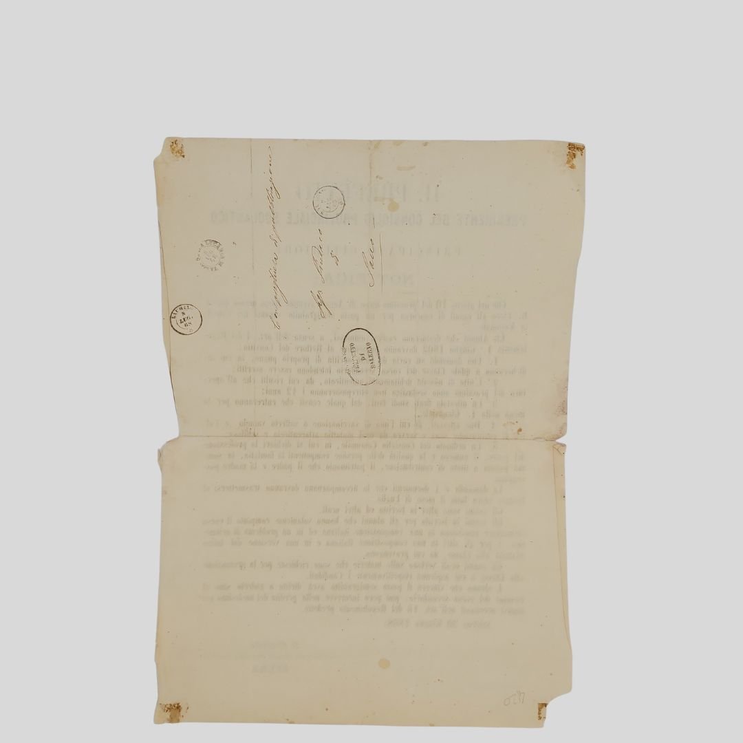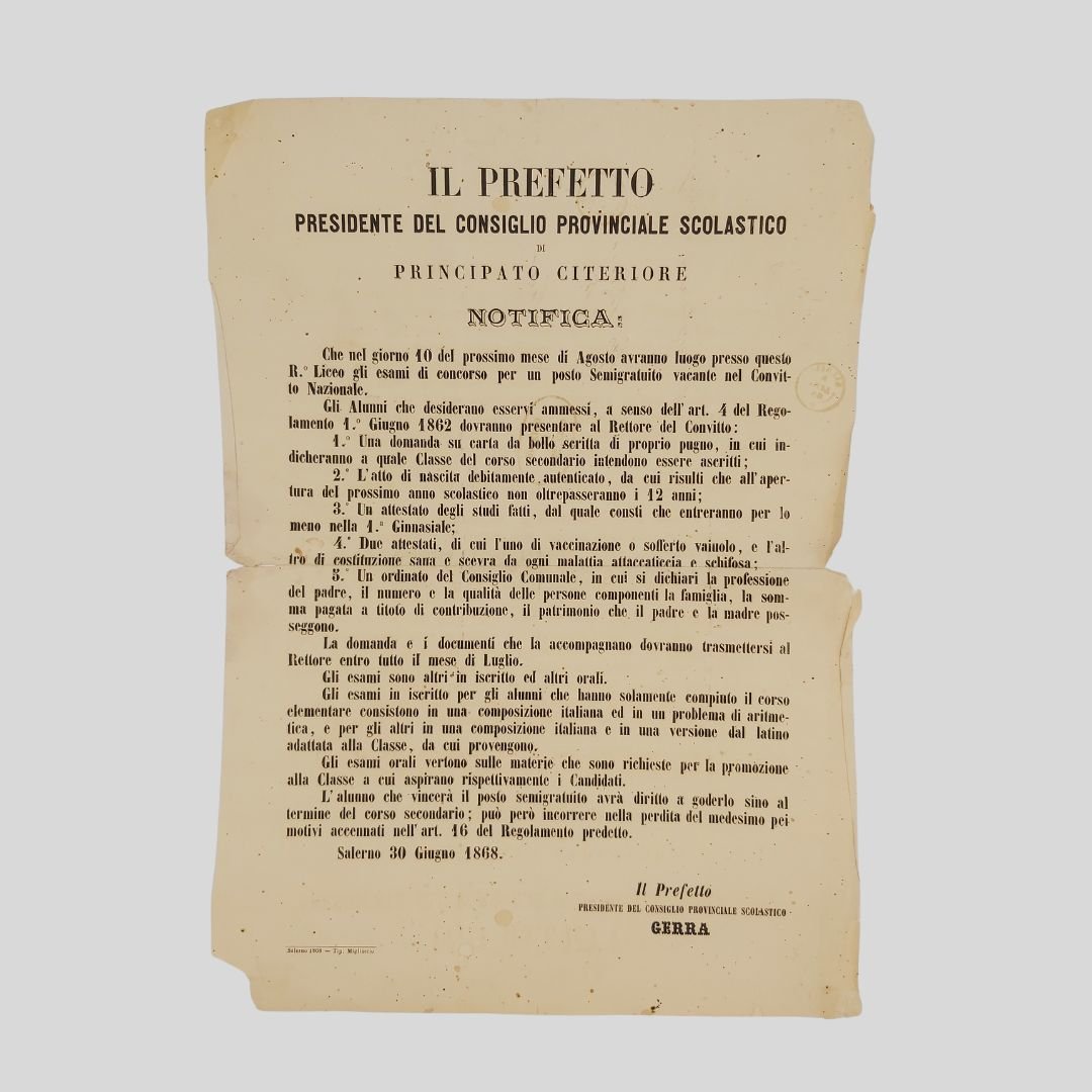 cm 43×31. Al verso invio manoscritto a china Con preghiera di pubblicazione, timbro prefettizio e altri tre circolari (datari). Tracce d’uso e naturali pieghe di archiviazione, ma in buono stato. Raro. Già Real Liceo di Salerno, il Convitto Nazionale Torquato Tasso, fu istituito con Decreto del 7 novembre 1811 dal Re delle Due Sicilie Gioacchino Murat e occupa l’area su cui sorgeva il Monastero femminile di Santa Maria Maddalena Esso fu istituito come sintesi dell’aspetto comunitario e di quello più propriamente didattico, secondo il modello dei Licei-Convitti francesi, conservando tale caratteristica indipendentemente dai diversi regimi politici succedutisi nel corso degli anni. Il Collegio assurse poi a Real Liceo e il 1 febbraio 1813, con un terzo decreto, gli fu associato un educatorio. Fino al 1860 il Convitto fu retto dai Padri Gesuiti ed in esso vennero attivate le cattedre universitarie di medicina, chimica e farmacia, ostetricia e materie giuridiche che furono abolite nel 1861. Da sempre il Convitto Nazionale ha costituito un punto di riferimento per la città di Salerno e l’intero Mezzogiorno, formando, attraverso studi rigorosi e una sobria educazione, diverse generazioni di insigni politici, patrioti, letterati e scienziati.