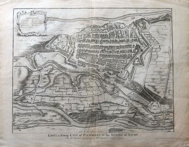 Dalla “History of England”, Olanda, 1724 (ma 1751). Incisione in rame all’acquaforte, b/n, cm 39,5 x 48,2 (alla lastra) più margini. Al piano della città in assedio si affianca una legenda in basso a destra. L’opera, secondo la concezione settecentesca, ha tentato di essere un lavoro esaustivo sulla storia dell’Inghilterra, dai tempi più antichi fino alla data di pubblicazione. Nicholas Tindal (1687 - 1774), un tempo cappellano del Greenwich Hospital, curò la traduzione dal francese dell' “History of England” di Paul de Rapin negli anni dal 1725 al 1727 e nel 1732 la ampliò con proprie note e mappe. La mappa fu pubblicata nell'opera "A summary of Mr Rapin de Thoyras's History of England, and Mr Tindal's Continuation, from the Invasion of Julius Caesar, to the End of the Reign of King George I. Illustrated With Medals, Plans of Battles, Towns, and Sieges", nel 1751. L'incisione presenta una pianta di Torino assediata dai Francesi durante la Guerra di Secessione Spagnola, nel 1706. L'assedio durò due mesi e la Francia era sul punto di vincere quando il principe Eugenio di Savoia arrivò con il suo esercito in soccorso del presidio della città, ponendo così fine al lungo assedio. Un'impressione leggermente attenuata ma in margini e in buono stato di conservazione.