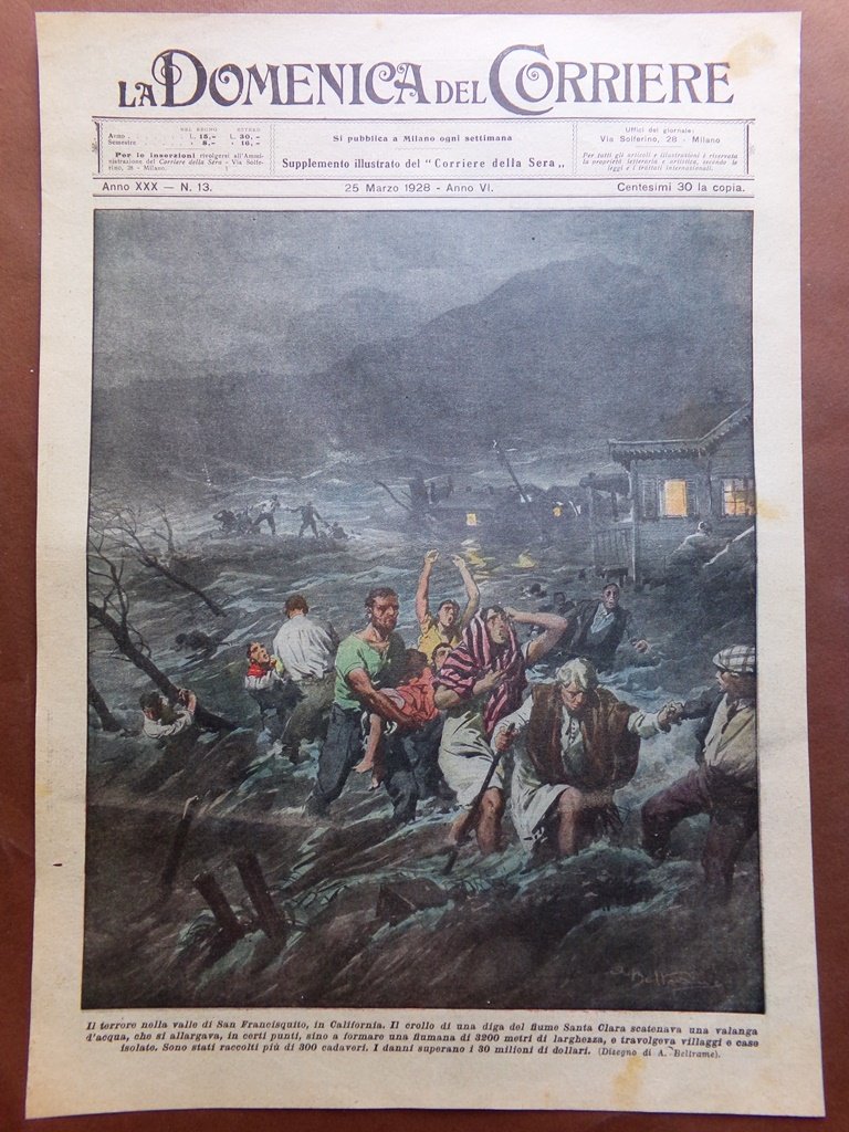 Copertina Domenica Corriere nr. 13 del 1928 Crollo Diga Santa Clara Francisquito