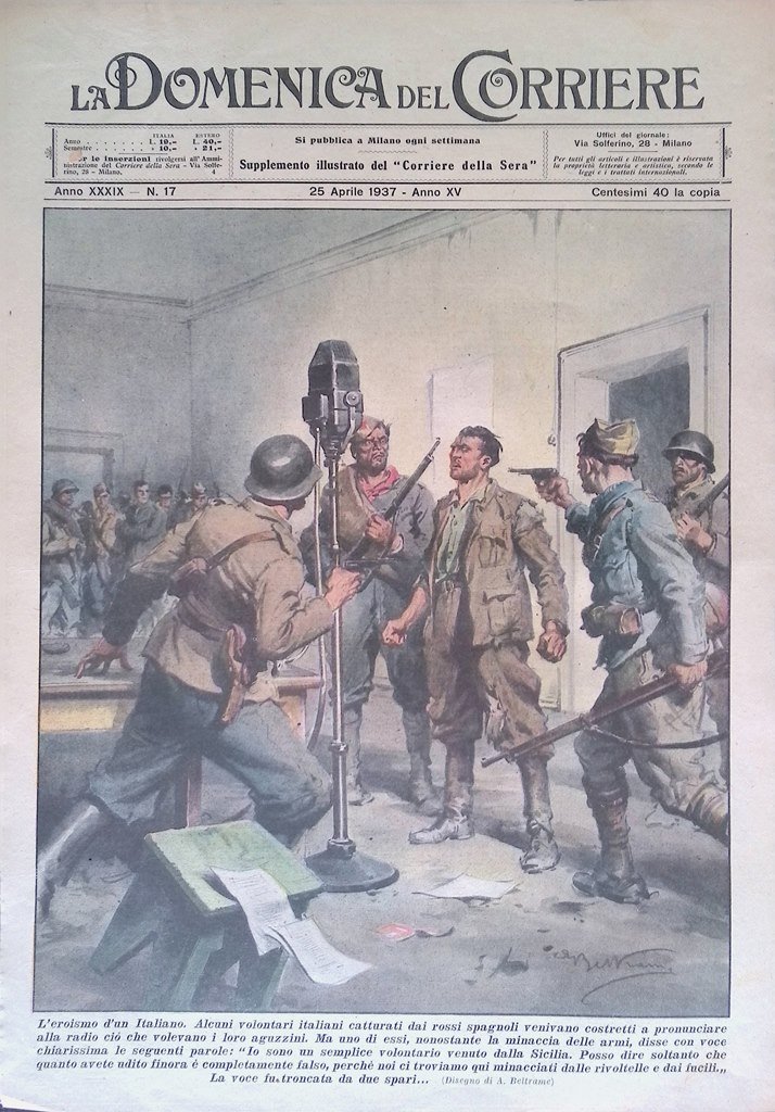 L'eroismo di un italiano. Alcuni volontari italiani catturati dai rossi spagnoli venivano costretti a pronunciare alla radio ciò che volevano i loro aguzzini. Ma uno di essi, dichiarò che quanto avevano detto i suoi compagni era falso e che erano minacciati dalle armi. La voce fu troncata da due spari (Achille Beltrame)