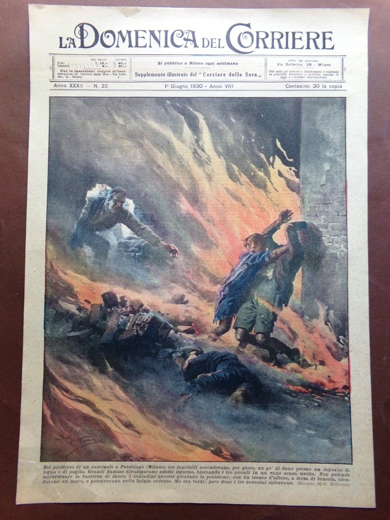 Nel porticato di un cascinale a Parabiago (Milano), tre fanciulli accendevano per gioco un po' di fieno presso un deposito di legna e di paglia. Grandi fiamme divampavano subito intorno, bloccando i tre piccoli in un vano senza uscita. Non potendo attraversare la barriera di fuoco, i contadini accorsi giravano la posizione; con un tronco d'albero, a forzad i braccia, sfondavano un muro e penetravano nella bolgia ardente. ma era tardi: poco dopo i tre poverini spiravano (Achille Beltrame)