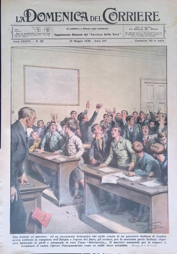 Una lezione al maestro. Ad un insegnante britannico che nella scuola di un quartiere italiano di Londra aveva criticato la conquista dell'Etiopia e l'opera del Duce, gli scolari, per la massima parte italiani, risposero balzando in piedi e intonando in coro l'inno "Giovinezza". Il maestro ammutolì per lo stupore e, terminato il canto, riprese l'insegnamento come se nulla fosse accaduto (Achille Beltrame)