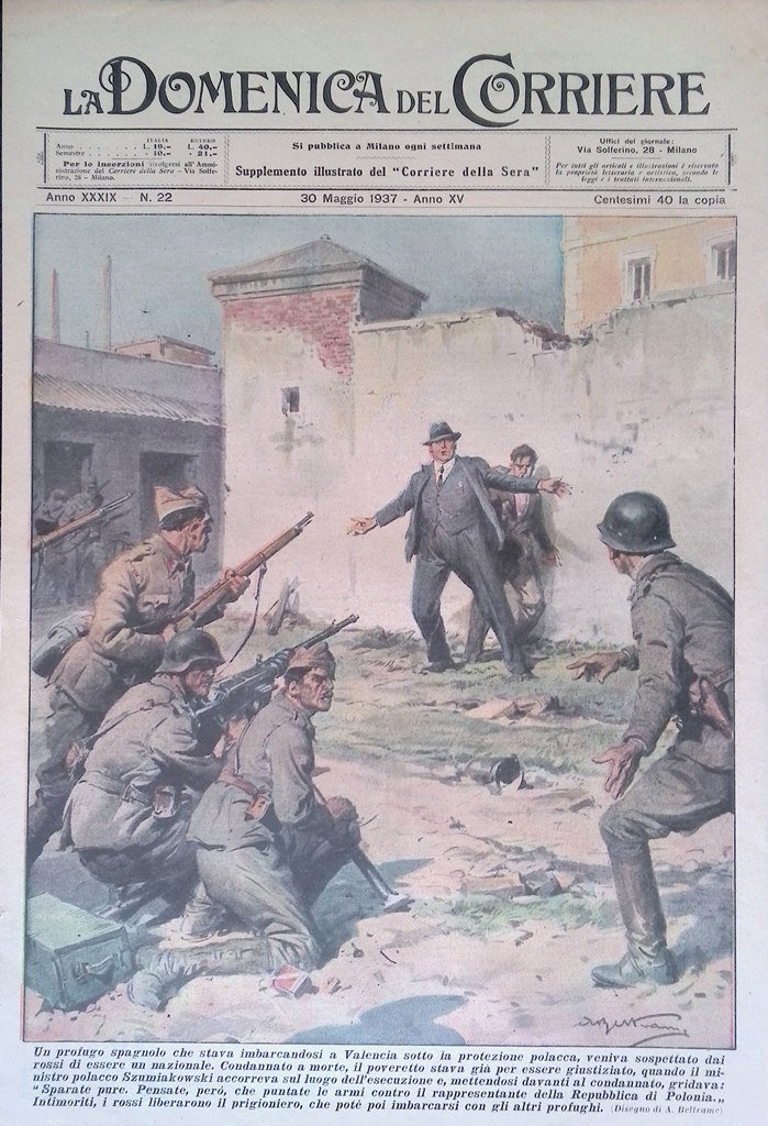 Un profugo spagnolo che stava imbarcandosi a Valencia sotto la protezione polacca veniva sospettato dai rossi di essere un nazionale. Condannato a morte il poveretto stava per essere giustiziato quando il ministro polacco Szumiakowski mettendosi davanti al condannato gridava "sparate pure". Il prigioniero fu poi liberato (Achille Beltrame)