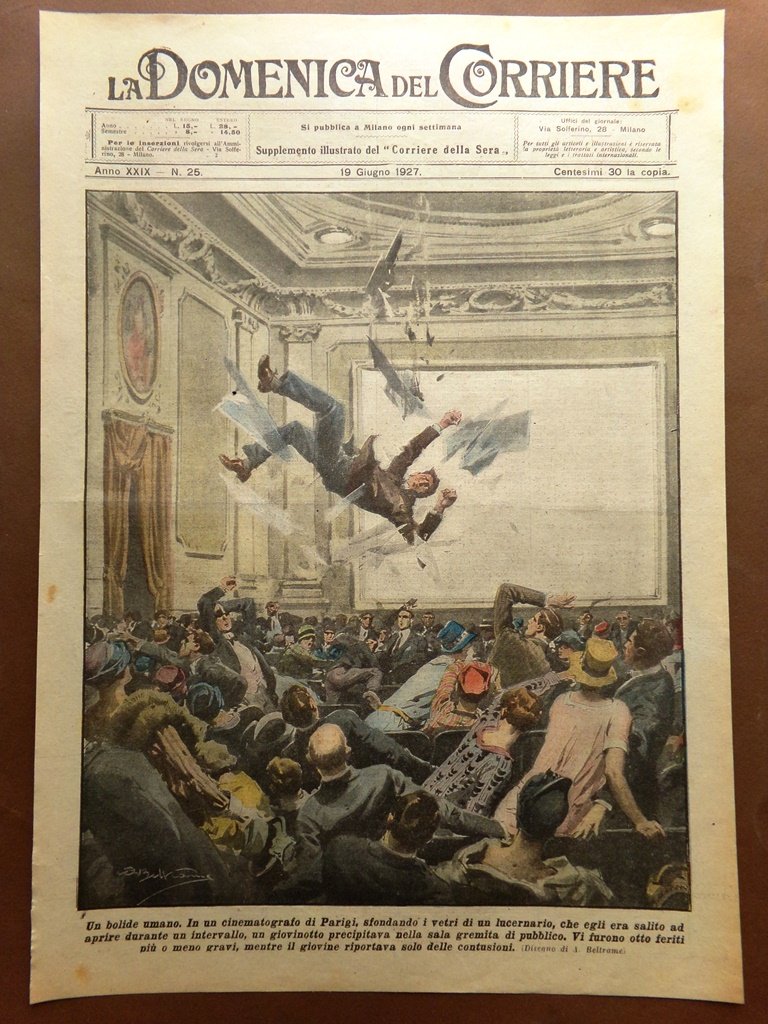 Copertina Domenica Corriere nr. 25 del 1927 Cinematografo Parigi Bolide Umano