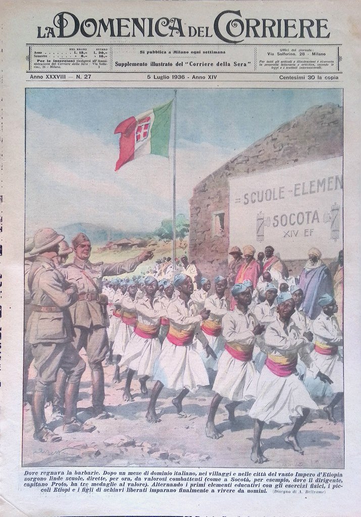 Dove regnava la barbarie. Dopo un mese di dominio italiano, nei villaggi e nelle città del vasto impero d'Etiopia sorgono linde scuole, dirette, per ora, da valorosi combattenti (come a Socotà, per esempio, dove il dirigente capitano Proto, ha tre medaglie al valore). Alternando i primi elementi educativi con gli esercizi fisici, i piccoli Etiopi e i digli di schiavi liberati imparano finalmente a vivere da uomini (Achille Beltrame)