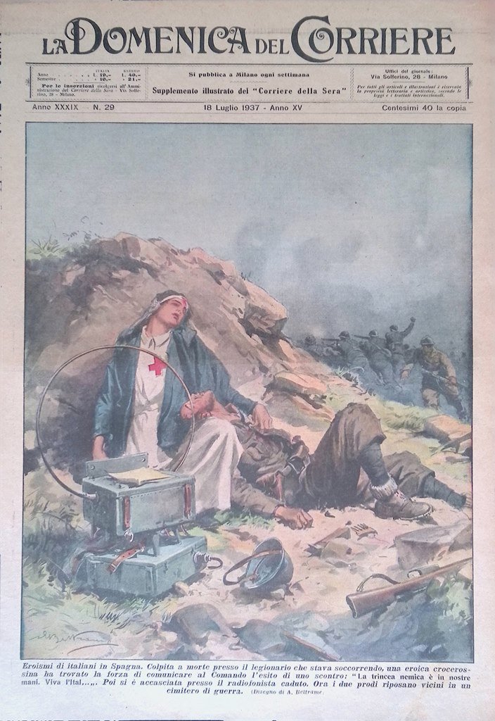 Eroismi di italiani in Spagna. Colpita a morte presso il legionario che stava soccorrendo un'eroica crocerossina ha trovato la forza di comunicare al comando l'esito di uno scontro, poi si è accasciata presso il radiofonista caduto (Achille Beltrame)