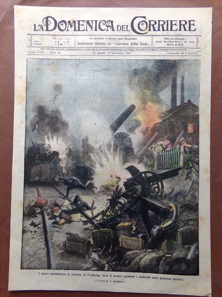 Copertina Domenica Corriere nr. 35 del 1916 WW1 Bombe Stazione Prebacina Nemico