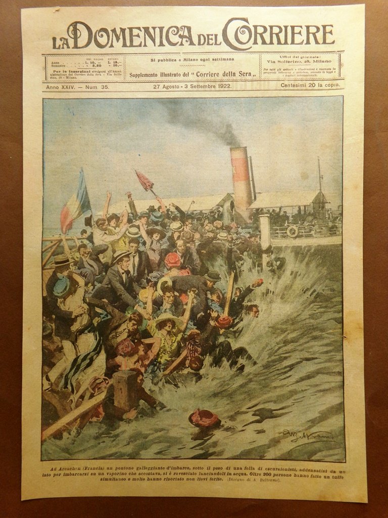 Ad Archachen (Francia) un pontone galleggiante d'imbarco, sotto il peso di una folla di escursionisti, addensatisi da un lato per imbarcarsi su un vaporino che accostava, si è rovesciato lanciandoli in acqua. Oltre 200 persone hanno fatto un tuffo simultaneo e molte hanno riportato non lievi ferite (Achille Beltrame)