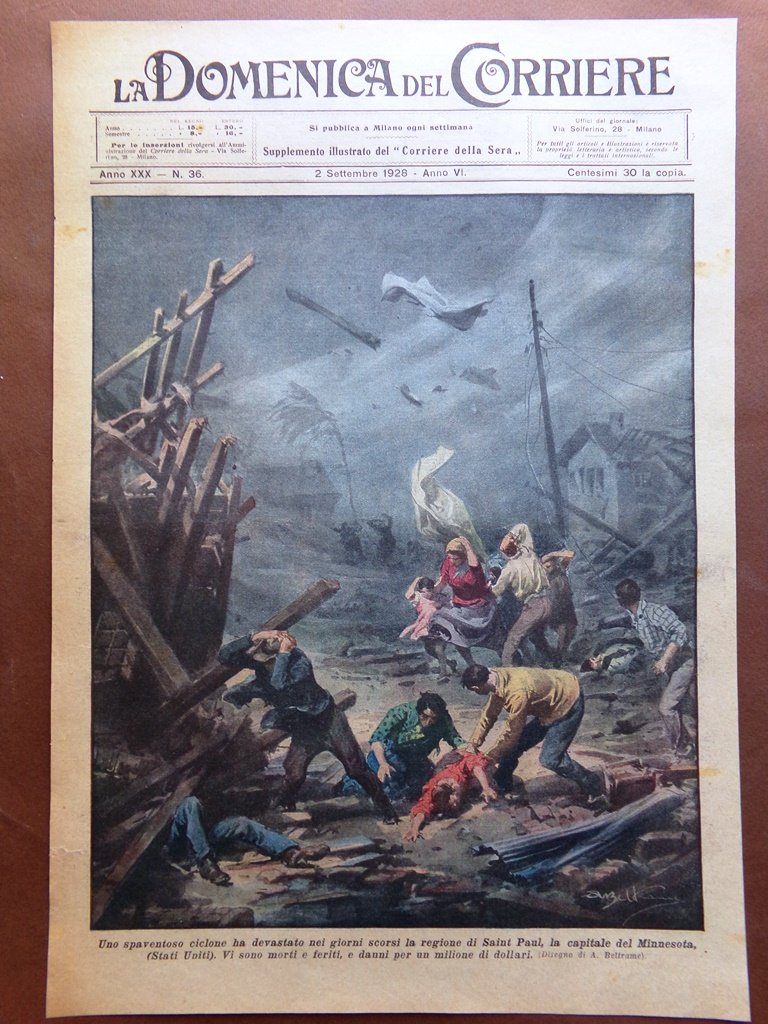 Copertina Domenica Corriere nr. 36 del 1928 Ciclone Saint Paul in Minnesota Usa