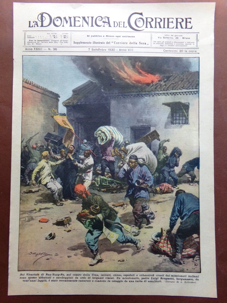 Copertina Domenica Corriere nr. 36 del 1930 Nan Yang Fu Cina Briganti Brugnetti
