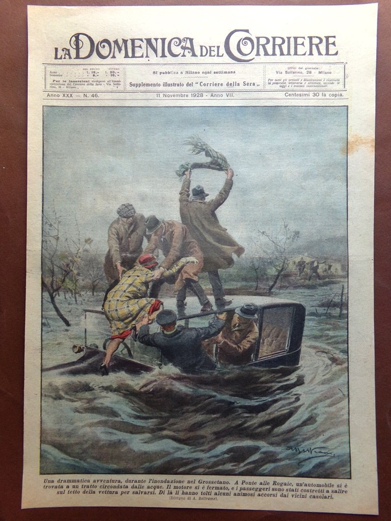Una drammatica avventura, durante l'inondazione nel Grossetano. A Ponte alle Rogaie, un'automobile si è trovata a un tratto circondata dalle acque. Il motore si è fermato, e i passeggeri sono stati costretti a salire sul tetto della vettura per salvarsi. Di là li hanno tolti alcuni animosi accorsi dai vicini casolari (Achille Beltrame)