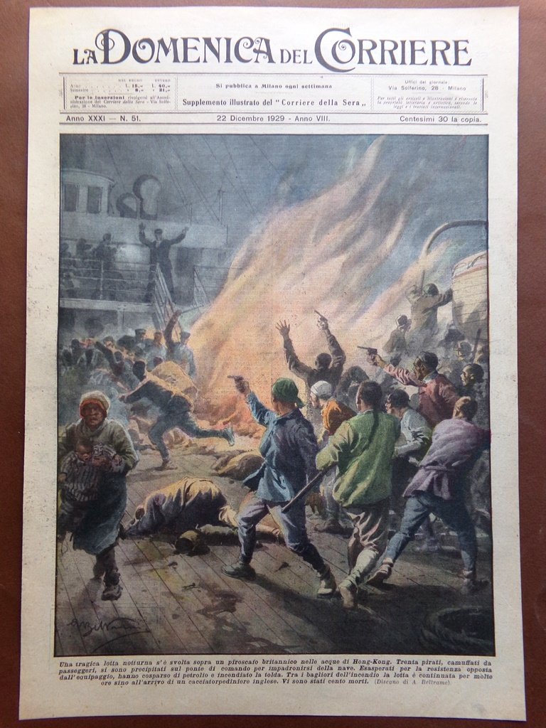 Una tragica lotta notturna si è svolta sopra un piroscafo britannico nelle acque di Hong-Kong. Trenta pirati, camuffati da passeggeri, si sono precipitati sul ponte di comando per impadronirsi della nave. Esasperati per la resistenza opposta dall'equipaggio, hanno cosparso di petrolio e incendiato la tolda. Tra i bagliori dell'incendio la lotta è continuata per molte ore sino all'arrivo di un cacciatorpediniere inglese. Vi sono stati cento morti (Achille Beltrame)