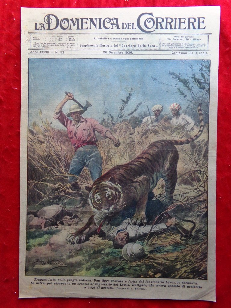 Copertina Domenica Corriere nr. 52 del 1926 Giungla Indiana Lews Tigre Battgate