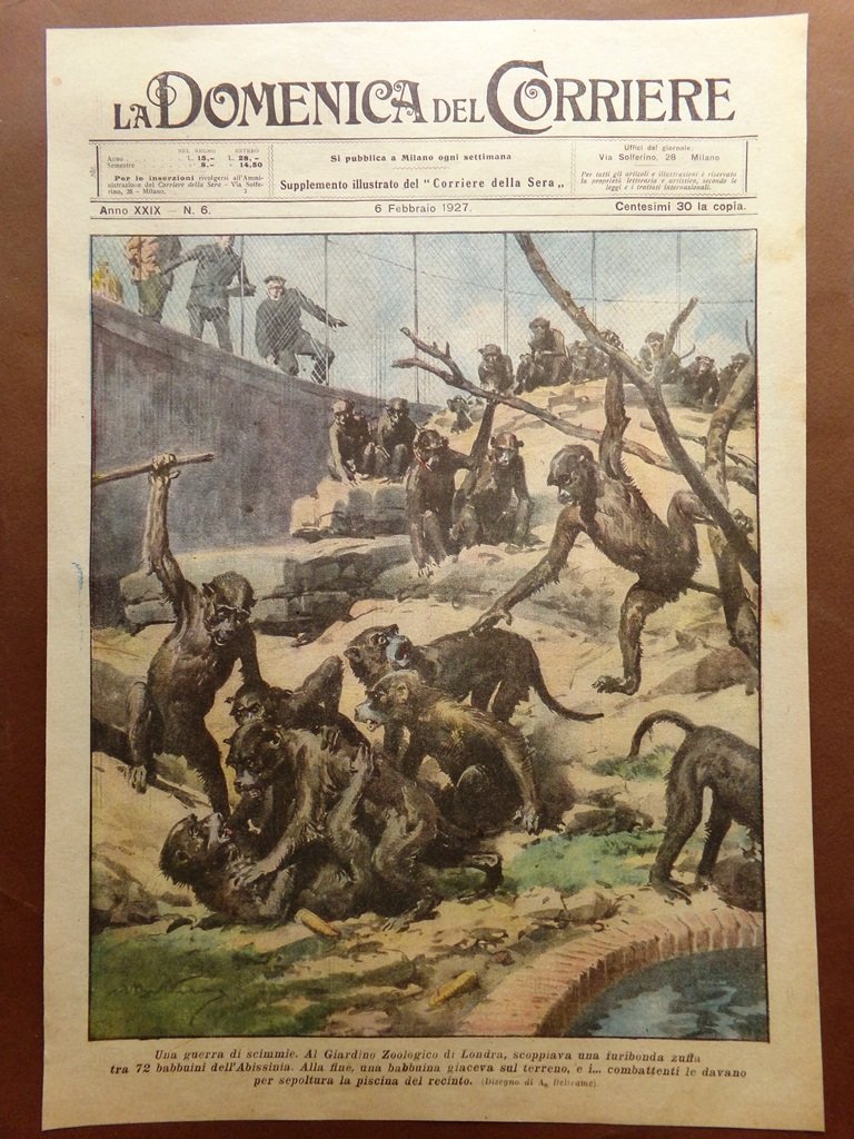 Copertina Domenica Corriere nr. 6 del 1927 Guerra Scimmie Zoo di Londra Babbuini