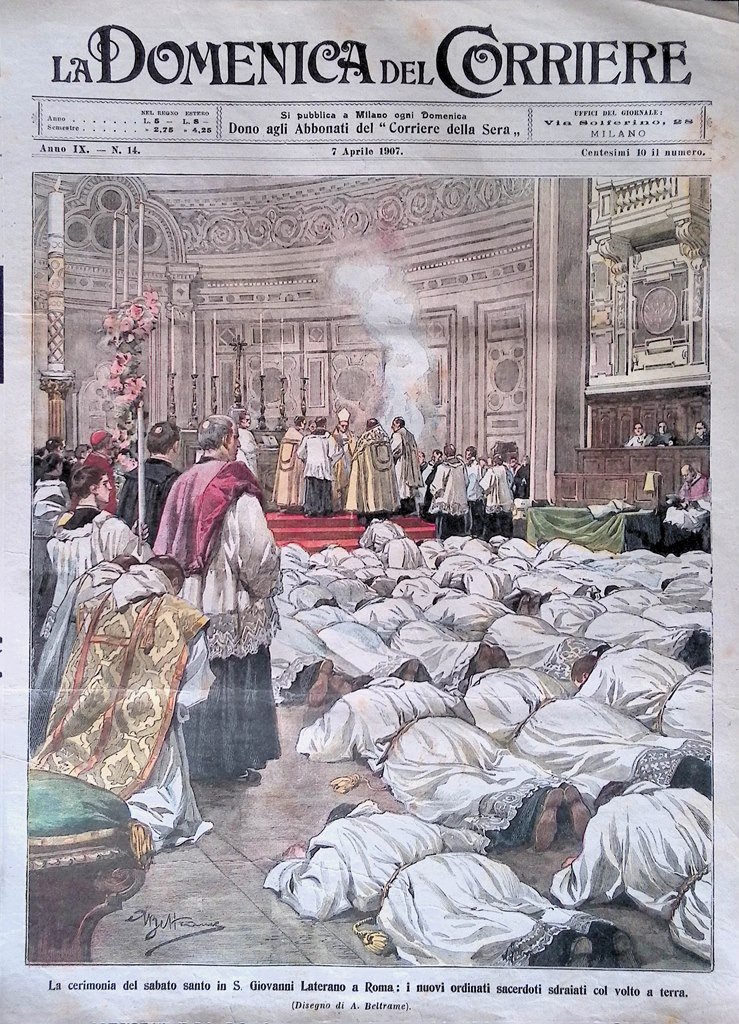 La cerimonia del sabato santo in San Giovanni Laterano a Roma: i nuovi ordinati sacerdoti sdraiati col volto a terra (Achille Beltrame)
