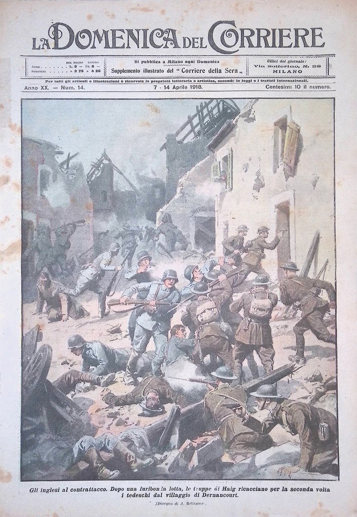 Copertina Domenica del Corriere nr. 14 del 1918 WW1 Contrattacco Inglesi di Haig