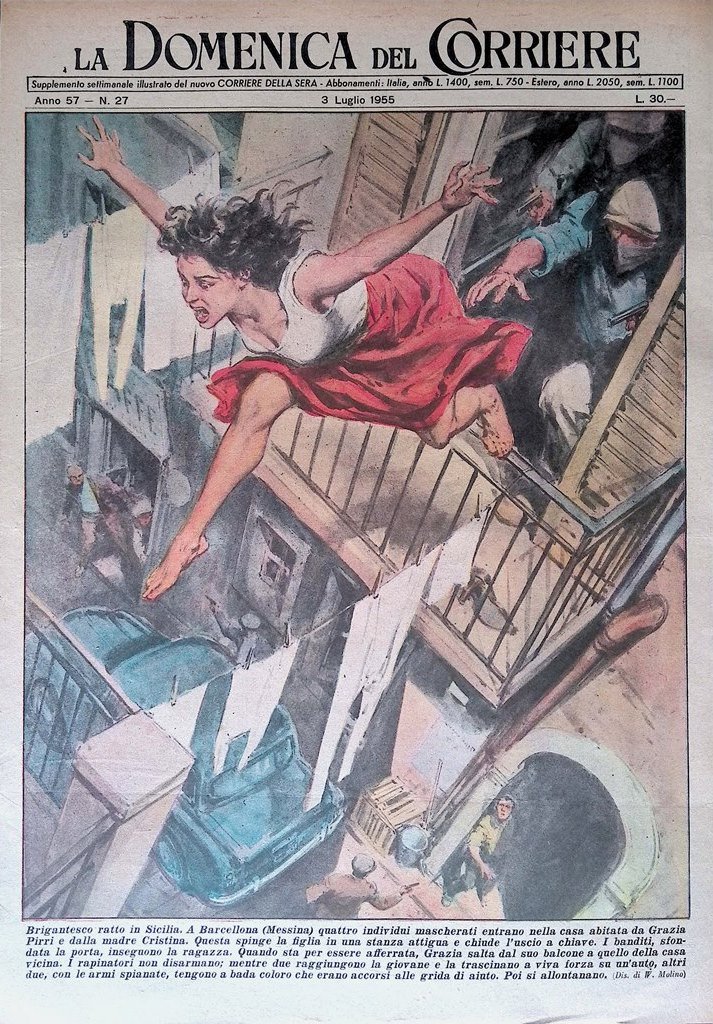 A Barcellona (Messina) quattro individui mascherati entrano nella casa abitata da Grazia Pirri e dalla madre Cristina. I banditi inseguono la ragazza che salta dal suo balcone a quello della casa vicina, ma riescono a raggiungerla e a rapirla (Walter Molino)