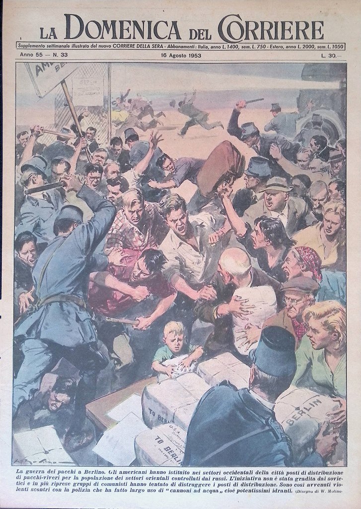 La guerra dei pacchi a Berlino. Gli americani hanno istituito nei settori occidentali della città posti di distribuzione di pacchi-viveri per la popolazione dei settori orientali controllati dai russi. L'iniziativa non è stata gradita dai sovietici e in più riprese gruppi di comunisti hanno tentato di distruggere i posti di distribuzione. Sono così avvenuti violenti scontri con la polizia che ha fatto largo uso di "cannoni ad acqua" cioè potentissimi idranti (Walter Molino)