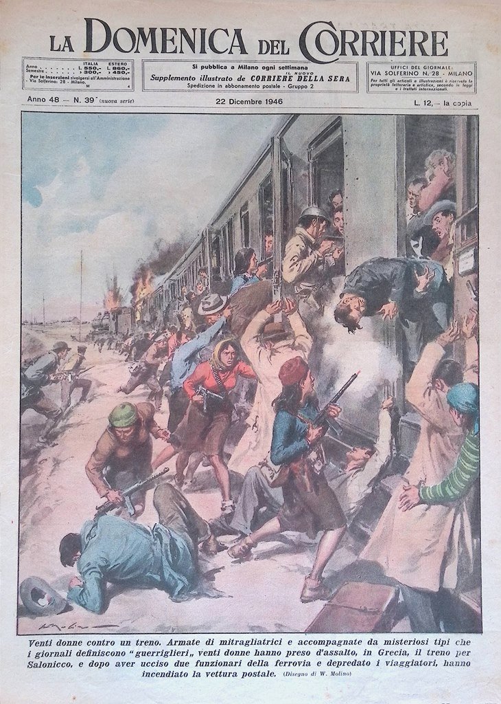 Venti donne contro un treno. Armate di mitragliatrici e accompagnate da misteriosi tipi che i giornali definiscono "guerriglieri" venti donne hanno preso d'assalto, in Grecia, il treno per Salonicco, e dopo aver ucciso due funzionari della ferrovia e depredato i viaggiatori hanno incendiato la vettura postale (Walter Molino)