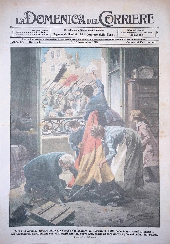 Copertina Domenica del Corriere nr. 44 del 1918 WW1 Libertà Patrioti in Belgio