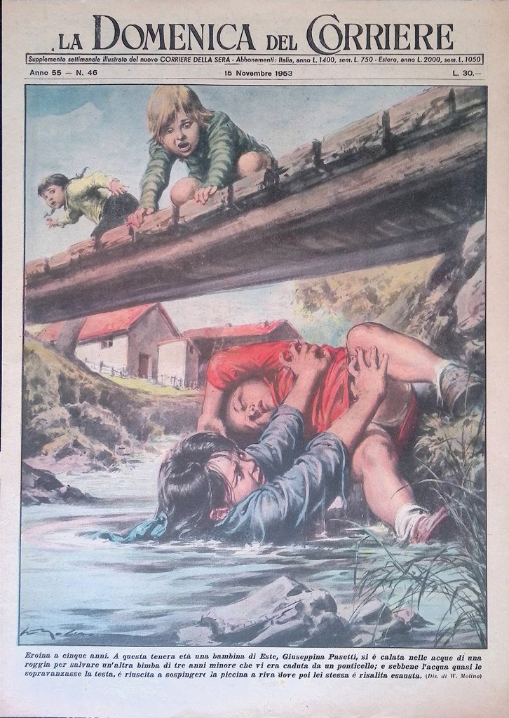Eroina a cinque anni. A questa tenera età una bambina di Este, Giuseppina Pasetti, si è calata nelle acque di una roggia per salvare un'altra bimba di tre anni minore che vi era caduta da un ponticello; e sebbene l'acqua le sopravanzasse la testa, è riuscita a sospingere la piccina a riva dove poi lei stessa è risalita esausta (Walter Molino)