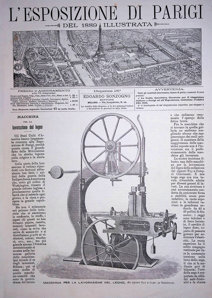 Copertina Esposizione di Parigi nr. 28 del 1889 Macchina Lavorazione Legno Fay