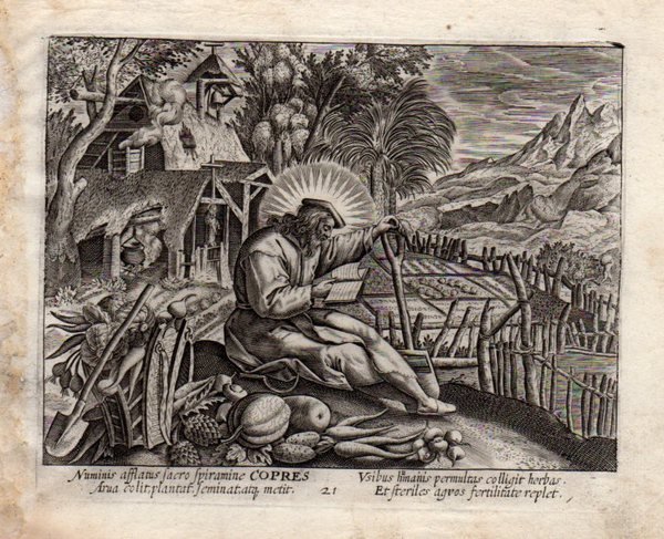 COPRES EREMITA - THOMAS de LEU [Leeuw or Le Leup or Deleu] (1560-1612) "Numinis afflatus spiramine COPRES." Splendida raffigurazione dell'eremita Copres mentre legge seduto nel suo orto tra vanghe, verdura e frutti della terra.