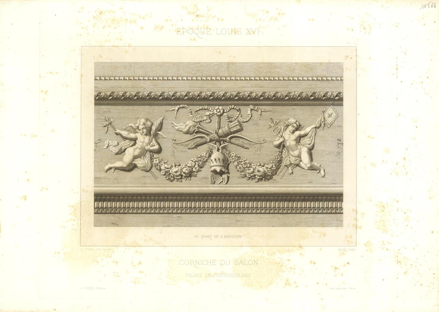 Incisione, antica ed originale, riproducente architetture all'Epoque de Louis XVI re di Francia dal 1774 al 1792. Autore: Pfnor M. Rodolphe delineò & diresse. Luogo: Fontainebleau Palazzo. Anno: 1865. Tecnica: incisione su lastra di rame. Dimensioni: 360x510 mm il foglio. Leggero foxing