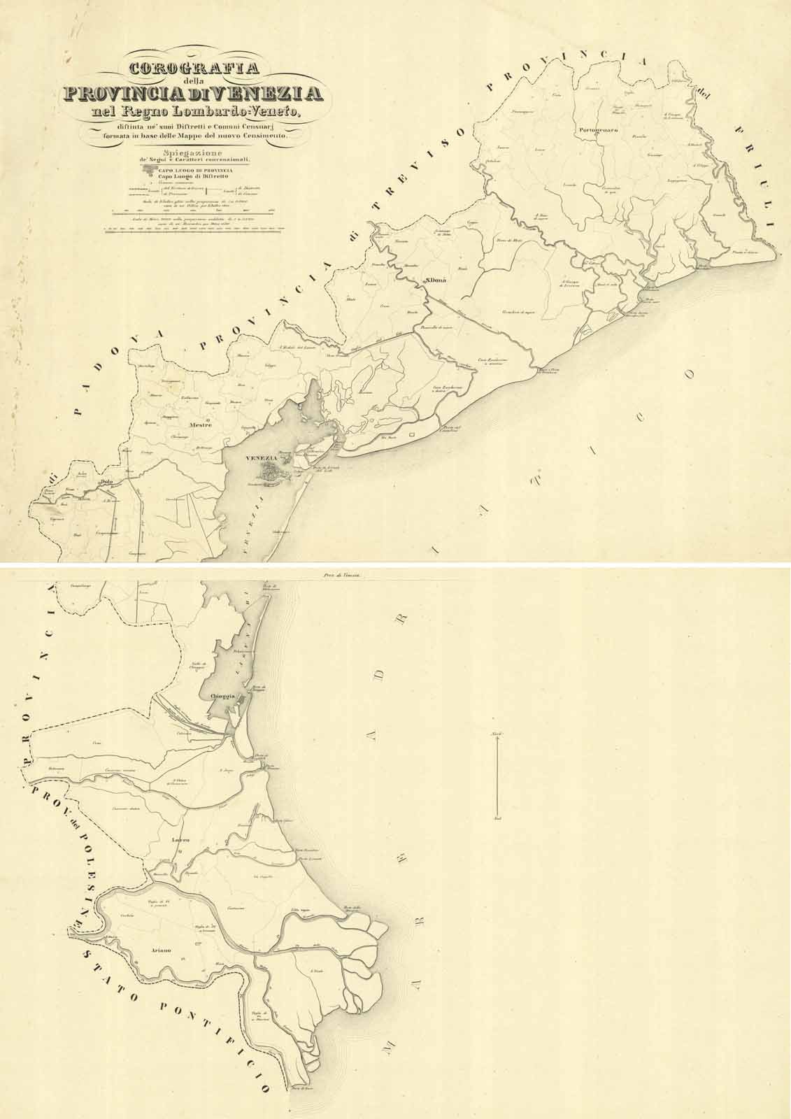 Carta corografica della Provincia di Venezia, in due fogli (mm 633x792 cd.), "distinta ne' suoi Distretti e Comuni Censuarj formata in base alle Mappe del nuovo Censimento". Nell'angolo in alto a sinistra, in campo libero, il titolo, sotto al quale è riportato l'elenco dei Segni, dei Caratteri convenzionali e le scale grafiche. L'opera è particolarmente attenta per quanto concerne la raafigurazione della situazione confinale della Provincia di Venezia con indicazione dei territori confinanti: Stato Pontificio, Provincia del Polesine, di Padova, di Treviso e del Friuli. Interessante la divisione confinale dei Comuni. La carta fa parte di una serie di corografie realizzate per ciscuna Provincia del Regno Lombardo Veneto. Rara, non menzionata dal Marinelli tra le carte edite nel XIX. Ottimo lo stato di conservazione generale