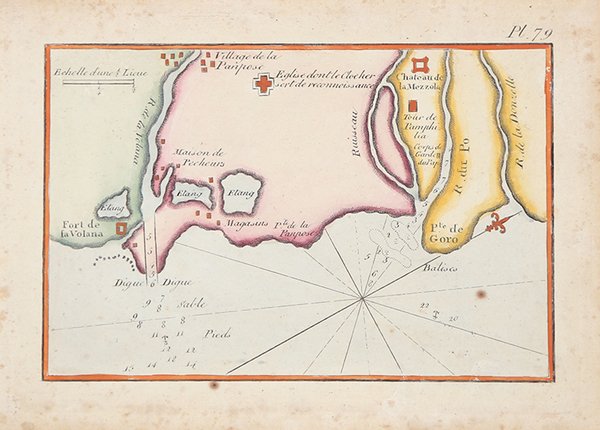 Piano nautico tratto dal " Recueil des principaux plans des ports & rades de la Méditerranée" di Josepgh Roux, pubblicato per la prima volta a Marsiglia nel 1764 e successivamente ristampato - ampliato - a Genova da Yves Gravier con il titolo "Recueil de 163 principaux plans des ports et rades de la Mediterranée" (1804).Ulteriore edizione dell'opera, con il titolo "Plans des ports ed des rades de la Mer Méditerranée." è stampata a Livorno da Carlo Tesi nel 1858. Incisione in rame, finemente acquarellata a mano, in ottimo stato di conservazione. First published in the "Recueil des principaux plans des ports et rades de la Mer Mediterranee", 1764, this nice nautical chart is taken from the rare "Plans des ports ed des rades de la Mer Méditerranée." published in Leghorn by Carlo Tesi, 1858. Copperplate with fine colouring, in very good condition. Cfr.