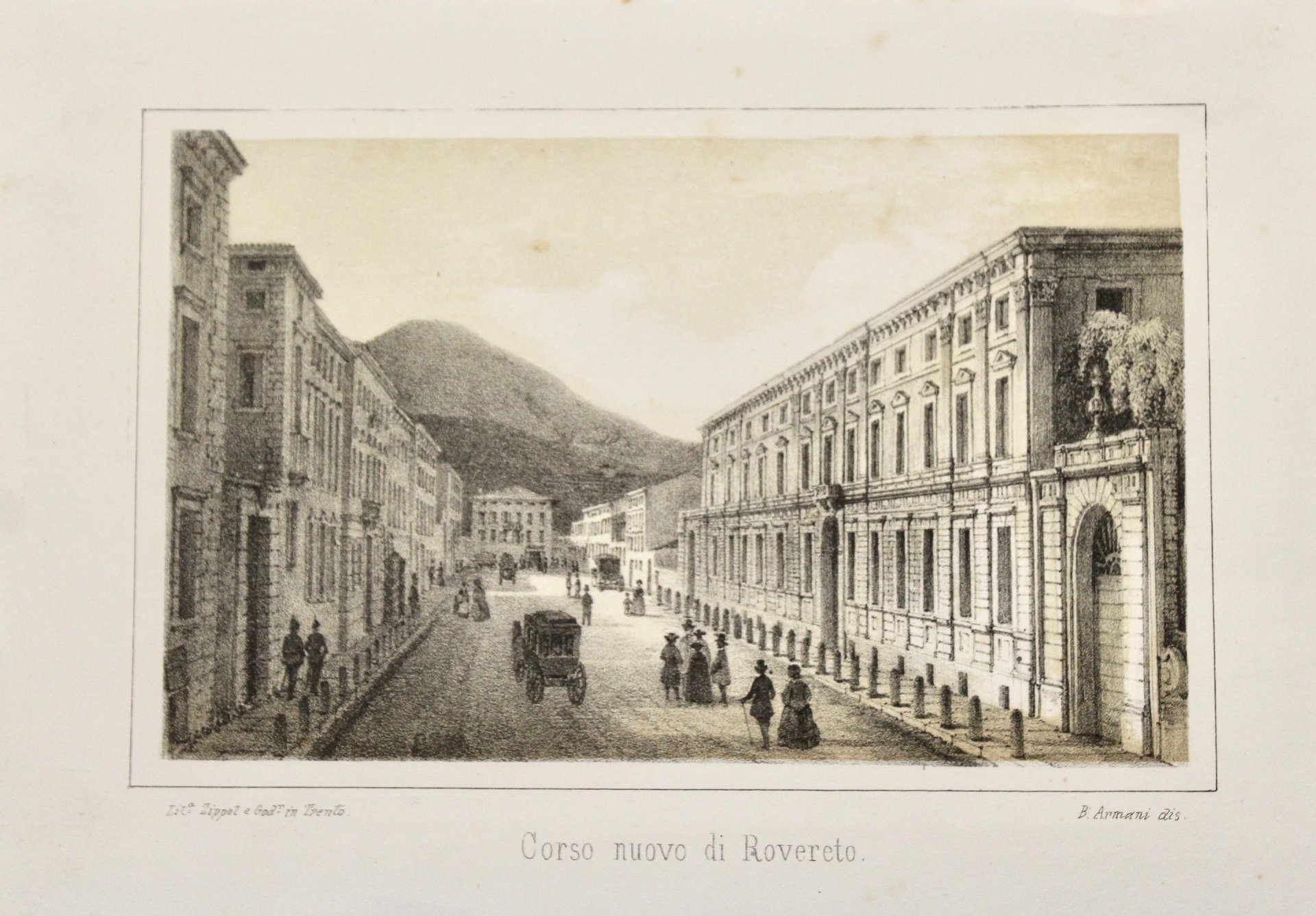 Litografia, mm 92x157 (immagine) tratta dalla rara serie pubblicata da Zippel e Godermaier. Basilio Armani (Riva del Garda 1817 – Malé 1899), fu pittore e incisore, reso celebre soprattutto dalle sue vedute litografiche di paesaggi gardesani, trentini e tirolesi. Ottimo esemplare assai marginoso.<BR>