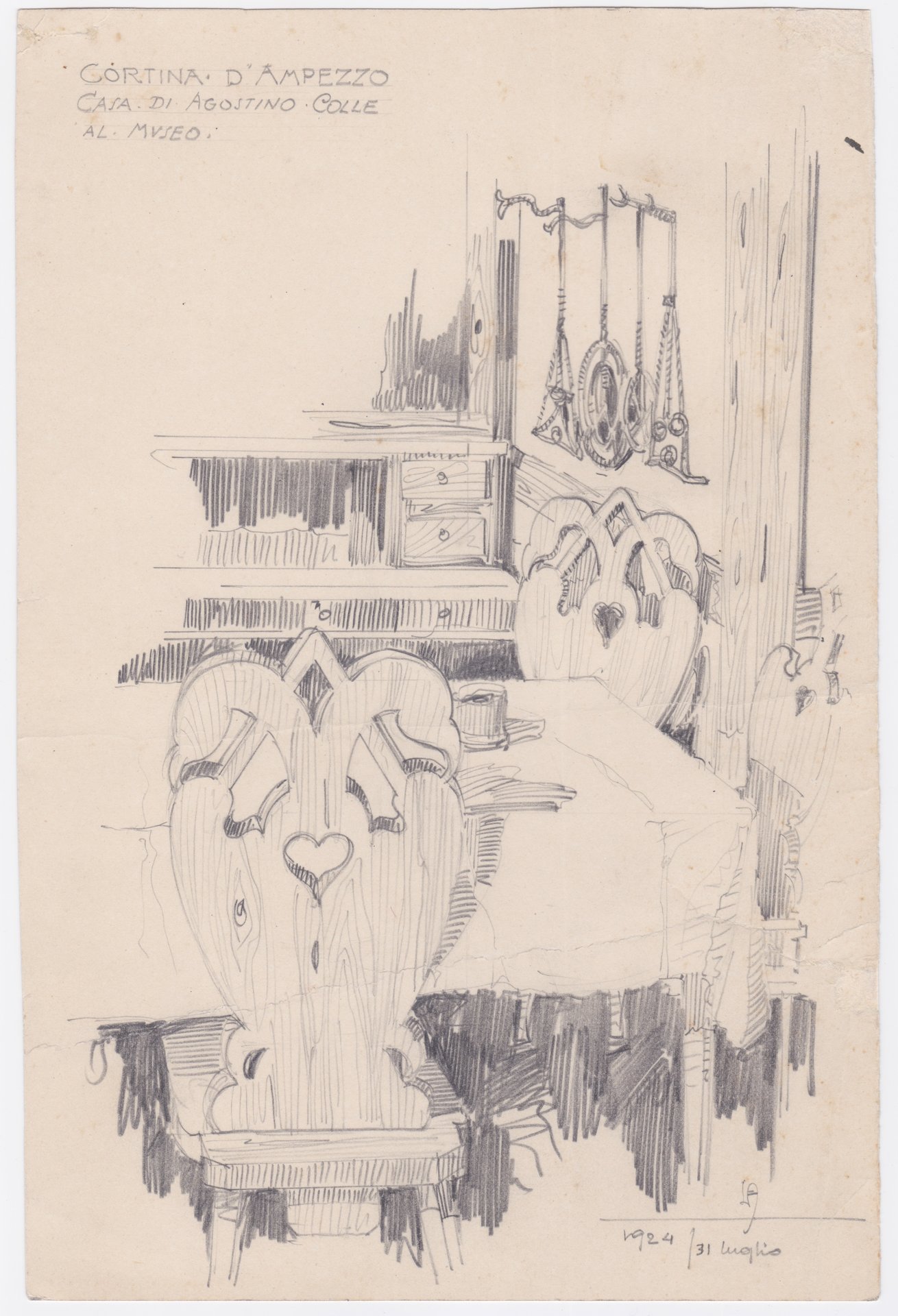 Scorcio dettagliato di un tipico interno ampezzano. Arredi di una sala in legno intagliato. La composizione è condotta con un segno per linee parallele, più o meno marcato in base alle esigenze del chiaroscuro, forse pensato per un'illustrazione. In alto a sinistra si legge: Cortina d'Ampezzo/Casa di Agostino Colle/al museo. Agostino Colle Codes fu Luigi, disegnatore, fu un artigiano tra i promotori nel 1905 del costituendo Museo Elisabettiano di carattere etnografico a beneficio dei turisti e della comunità. Il museo, dedicato alla "compianta nostra Imperatrice e Regina Elisabetta" chiese alla comunità vecchi che potessero documentare la vita nel passato a Cortina, ebbe però vita breve e travagliata. Nel 1923 venne smantellato per destinarne i locali ad altro uso, gli oggetti definitivamente dispersi nel 1929 e solo una piccola parte è oggi nel Museo delle Regole. Per una ricostruzione della vicenda si veda il Notiziario delle Regole d'Ampezzo, n 34 del luglio 1995. Firma a matita in basso a destra: LA 1924/ 31 luglio. Il disegno è dunque un interessante e raro documento delle vicende dello sfortunato museo nel 1924 già trasferito dalla sede originaria.
